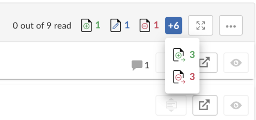 If there are more than three file diff types in the file list panel, only the first three are displayed and the rest are available to view in a drop down. This is to prevent overlap of the file path name and the icons. In the example, there are nine files in the changelist of five different file types. The first three types displayed are for added, edited and deleted files, with one of each of these file types in the changelist. The other six in the changelist are for the three files that were added and moved, and the three that were moved and deleted.
